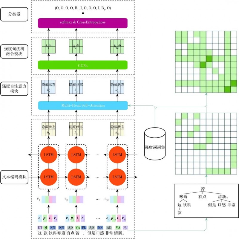 从食品品评文本中进行感官分析与上述意见词提取研究类似,两者都需要从文本中自动提取出与某一方面相关的特征描述词,并分析这些词与方面之间的关系。因此,意见词提取中的一些技术和方法可以为食品感官分析提供启发和支持。不过,在食品感官分析领域,感官信息既包括甜、酸、苦、咸等基本味道,也包含质地、口感润滑度、粘稠度等多方面信息;同时每一种感官信息都有自己的强度属性。例如某一款饮料的甜度较强,但是酸度较弱,在这种情况下仅提取出酸和甜无法细粒度刻画其感官评价。这导致已有的意见词提取研究难以直接应用在食品感官分析领域,无法直接捕捉食品感官评价中的感官词及对应的感官强度、难以对感官强度进行细粒度处理。