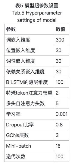 模型中的基本超参数沿用文献的模型,强度注意力模块和强度句法树融合模块的超参数取自超参数实验的最优结果,具体设置如表5所示。