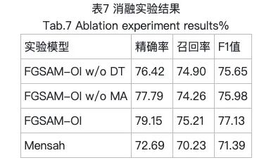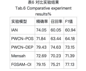 表6的实验结果是3次随机实验的平均值,结果证明了FGSAM-OI的总体有效性。其性能优于未考虑句法信息的基线模型Mensah和IAN模,同时对比性能较好的模型PWCN-DEP在召回率和F1值上也取得了一定的提高。这表明FGSAM-OI能够尽可能捕捉到所有与特定方面相关的感官词,以确保分析的全面性和综合性。同时可以看出基于依赖权重和依存矩阵等句法信息的模型往往能够更充分地捕获感官词,从而能在感官分析任务中表现出更好的效果。不过,PWCN-DEP在精确率方面表现出了更好的效果,这可能是因为FGSAM-OI通过引入注意力机制以关注句子中的强度信息,但由于注意力分配比较集中,从而忽略了部分感官词等其它句子成分,进而略微影响了模型的精确率。