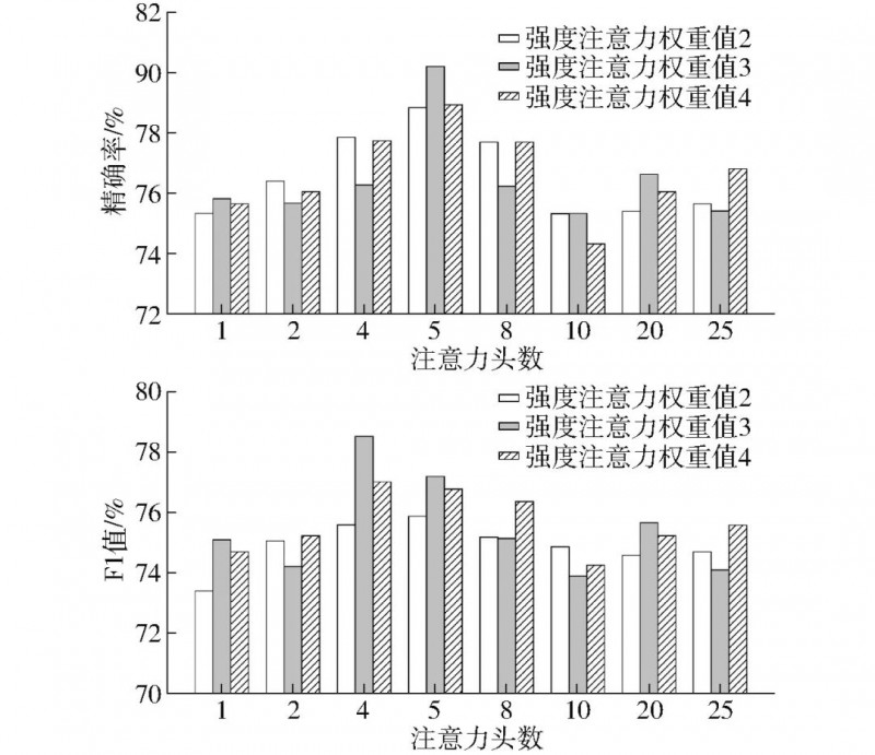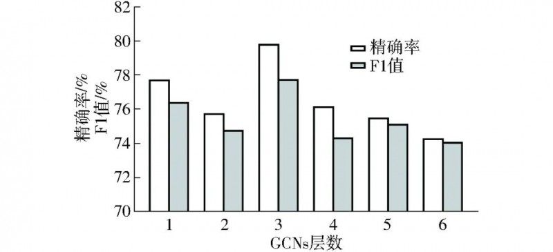 图4展示了注意力模块相关参数的实验结果,由于多头注意力机制中需要确保特征维度可以被注意力头数整除,且注意力头数一般不宜过大,所以选取了1~25的所有可能的注意力头数进行了实验。可以看到对于所有的注意力权重值,精确率和F1值表现出相似的变化趋势。具体来说精确率在注意力头数为5时表现出最好的效果,F1值则在注意力头数为4时效果最好。因此在后续进行模型调优时可以优先考虑将注意力头数设置为4或5。而通过图5的依赖树相关超参数实验,GCNs的层数设置为3时精确率和F1值均取得峰值,这也符合现有的大多数GCNs应用实践说明层数过少可能会导致表示能力不足、信息传播受限,过高的层数则会导致梯度消失和梯度爆炸以及计算复杂度的增加,只有适中的GCNs层数才能更好地利用强度句法树,从而更好地融合输入文本中的句法结构信息。