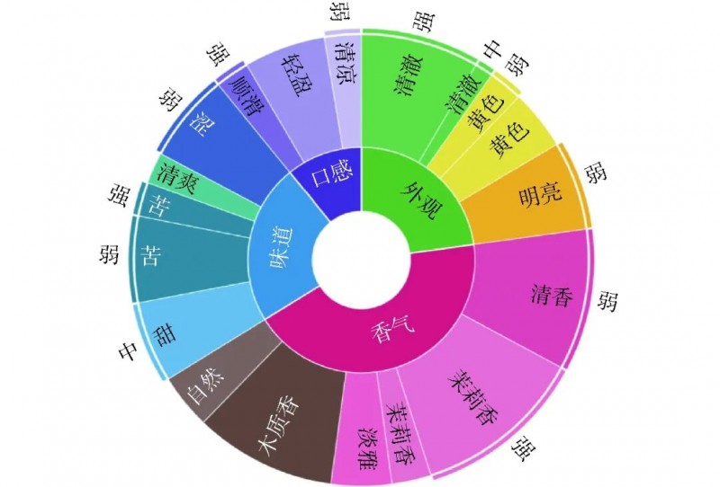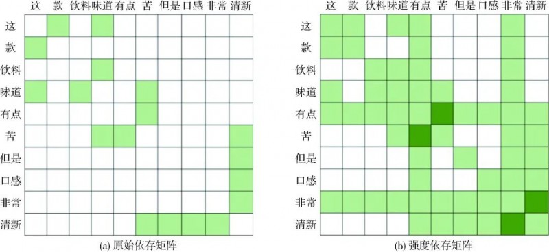 首先,以一款饮料的品评文本“这款饮料味道有点苦,但是口感非常清新。"为例,结合模型的数据处理过程进行案例说明。经过分词和原始依存句法树分析后,该品评文本对应的原始依存矩阵如图6a所示。通过观察句子结构不难看出,“有点”和“苦”以及“非常”和“清新”之间的关系对于提取感官强度非常重要。因此所有感官强度词参与的依存边都会获得更高的权重,从而更好地提取强度信息。模型中为了更好地在GCNs中传播信息,每个节点还添加了自循环,从而得到了最终的强度依存矩阵(图6b)。针对测试数据集中的品评文本,提取出感官词及感官强度后对结果进行统计与汇总,可得到饮料最终的感官分析轮状图,如图7所示。