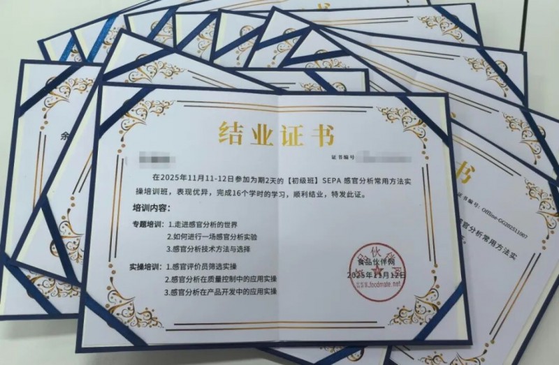 2025年11月11-12日,由食品伙伴网主办的SEPA感官分析常用方法实操培训班(第七期)在济南感官分析研究中心圆满结班。来自浙江柏客健实业有限公司、天津顶益食品有限公司、爱普香料集团股份有限公司等多家企事业单位学员参加了此次培训。大家齐聚泉城济南,共同进行感官充电!