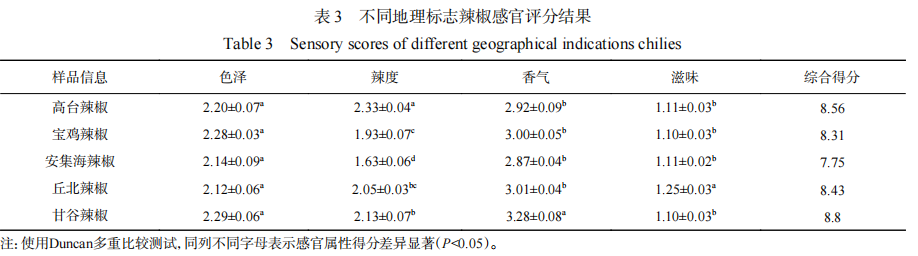 经陶兴林等人[3]研究中以表2所示为标准感官分析得出在高台辣椒、宝鸡辣椒、安集海辣椒、丘北辣椒、甘谷辣椒感甘谷辣椒色泽最好,辣度适中,香气最优,滋味好的特点(结果见表3)。风味物质检测中5个样品中共检测出 11类,65种挥发性风味物质,主要包括烷烃类13种、烯烃类11种、醛类10种、醇类8种、酮类7种、醚类4种、酯类5种、酸类3种、呋喃类2种、吡嗪类1种、胺类1种。5 种不同辣椒样品分别鉴定出来挥发性风味物质的数量为高台辣椒37种、宝鸡辣椒33种、安集海辣椒31种、丘北辣椒30种、甘谷辣椒45种,甘谷辣椒样品种所检测出的挥发性风味物质种类最多。其中5-丙基癸烷和(E)-2-庚烯醛两种挥发性风味物质为甘谷辣椒独有,呈现果香及花香味。