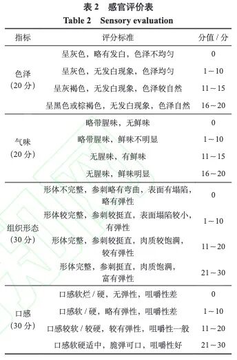 选择10名经过专业感官培训的专业人员参与感官评定,男女各5人,采用目测、鼻嗅、口尝等感官评价方法进行判定评分。评定过程中互不影响,且品尝前均漱口。试验评分标准见表2。