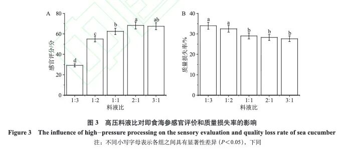 由图 3 可知,随着料液比的增加,海参的感官评分逐渐增加,料液比为 2∶1 时感官评分最高,此时海参口感软硬适中,咀嚼性好。料 液 比 3∶1 与 2∶1 的 感官评分没有显著性差异(P>0.05),料液比小于 2∶1 时,随着料液比的减小即水量增加,导致海参没入水中的体积增大,高压后海参硬度小,基本无弹性,口感差,且海参主要的呈味氨基酸甘氨酸和谷氨酸等溶解于水中,导致海参风味下降,失去了其原有的鲜味,降低了产品品质。随着料液比的增加,海参的质量损失率呈减小趋势,料液比 1∶1 时,质量损失率明显减少,料液比大于 1∶1 时,质量损失率减小不明显,质量损失减少意味着产品出成率的提高。海参受热过程中的质量损失主要是因为热处理破坏海参胶原蛋白结构,造成水分和可溶性成分的流失。