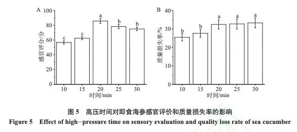 由图5可知,随着高压时间的增加,海参感官评分先增加后减小。高压时间20min感官评分最大,口感最好。高压时间小于20min时,海参口感差,硬度大、咀嚼性差、无弹性。高压时间超过20min时,海参整体偏软,感官评分较小。随着高压时间的增加,海参的质量损失率呈增加趋势,高压时间20min,质量损失率明显增加,高压时间超过20min,质量损失率变化不显著,与李志超研究结果一致,随着水煮时间的增加,海参组分的流失程度加重,影响着海参的营养品质。