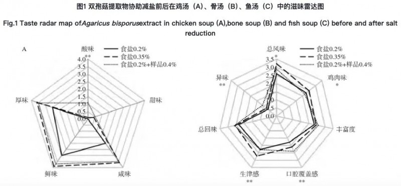 本研究发现双孢菇提取物对三种肉汤均起到减盐作用。试验结果表明,双孢菇提取物的添加使得肉汤中游离氨基酸的含量均有所增加,减盐后游离氨基酸含量显著高于减盐前;5’-核苷酸对鸡汤和骨汤的呈味贡献影响较小;感官评价确定双孢菇提取物的添加对肉汤起到增咸作用,并且会延长咸味在口腔中的持续时间,总体风味强度也有所增强。双孢菇提取物添加到肉汤里不是仅增加呈味核苷酸和氨基酸的含量,其中双孢菇提取物中含有的Kokumi肽也起到增鲜增咸的效果。试验验证了双孢菇提取物在三种肉汤中协助减盐作用明显,在鱼汤中应用效果最佳,直接减盐33%。双孢菇提取物不仅起到减盐提鲜的效果还能增加汤的持久性、丰富性。