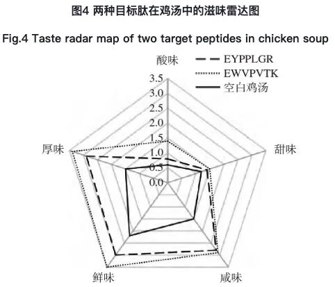 将0.1%的目标肽EYPPLGR、EWVPVTK分别添加到空白鸡汤中,两种肽在鸡汤体系中均表现出浓厚感、满口感、绵延感和增强味觉复杂口感的风味特征。如图4所示,两种肽在鸡汤中增强咸味、鲜味及厚味效果明显,甜味感知也有所增强。除此之外,两种目标肽在鸡汤中都表现出酸味增强的特点,这可能是由于在合成肽的过程中醋酸盐的残留所造成的,或是目标肽本身具有酸味的特点。通过感官验证,双孢菇提取物中分离纯化鉴定出的两条Kokumi目标肽在鸡汤中起到了减盐作用。