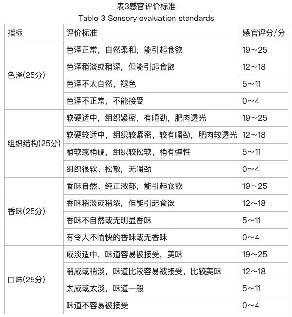 将腊肉经30 min煮熟后切成0.5 cm厚的肉片,随机分配给每个评价员进行感官评价,评价小组由10名食品相关专业人员组成,分别从色泽、组织结构、香味和口味4个方面进行评价,满分为100分,结果取平均分。感官评价标准见表3。