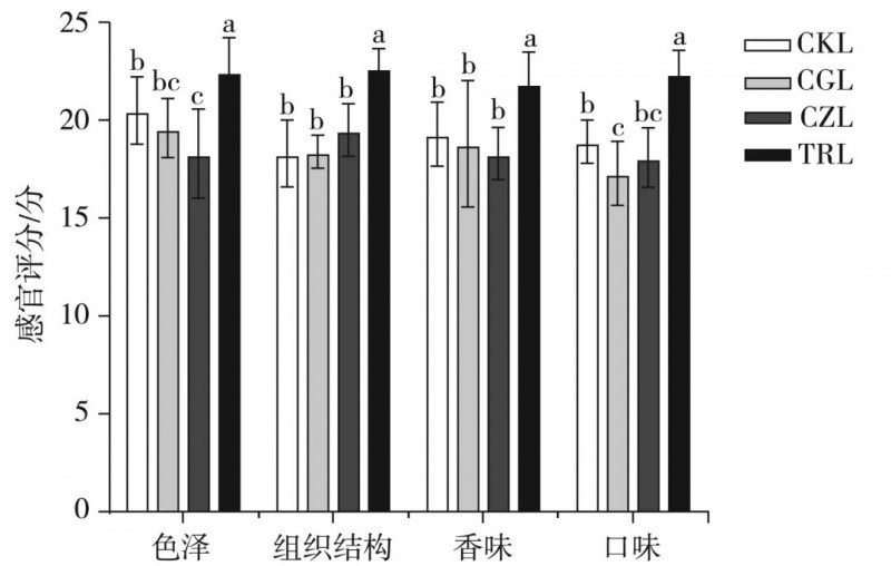 腊肉的感官品质对消费者的喜好起决定性作用。本研究从色泽、组织结构、香味和口味4个方面对贵州不同地区传统腊肉与多步烘烤腊肉进行感官评价,感官评分见图2。由图2可知,TRL在色泽、组织结构、香味和口味方面的感官评分都显著高于其他3个样品(P<0.05)。TRL的色泽自然且肥肉透光,软硬适中,组织紧密,香味自然、纯正浓郁。其余3个样品与TRL在组织结构上感官评分差异最大,因此可以推断多步烘烤能使腊肉保持较好的口感。