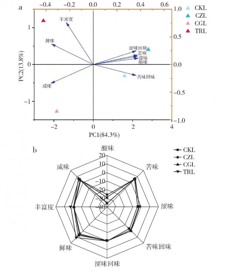 为探索多步烘烤腊肉与贵州不同地区传统工艺腊肉的风味品质差异,对4种腊肉进行电子舌分析。电子舌由8个传感器和Ag/AgCI参比电极组成,涵盖了酸味、苦味、鲜味、咸味、涩味、苦味回味、涩味回味和丰富度8种味道,射线越靠外面,表明相应指标的味道越大。贵州不同地区传统工艺腊肉与多步烘烤腊肉电子舌数据的主成分分析图和雷达图见图7。由图7中a可知,PC1与PC2的贡献率分别为84.3%、13.8%,累计贡献率为98.1%(>90%)。因此,PC1和PC2包含的信息可以反映整体数据特征。4个样品之间由于不同的味觉特征而分布在不同的区域,TRL与其他样品分离主要是由于鲜味与丰富度产生的差异。由图7中b可知,TRL的鲜味和丰富度高于其他3组,多步烘烤腊肉采用柏香木和青冈木在45~55℃冷烟慢熏,烟熏发酵180d以上。其余3个腊肉样品可能由于烟熏时间太短,产品的丰富度和鲜味低于TRL。此外,TRL的酸味低于其他3组,TRL经过多步烘烤可能促使酚类物质与腊肉样品中的其他成分(如氨基酸、肽类等)发生结合或转化,形成了酸性较弱的复合物,从而降低了游离酚类物质带来的酸性贡献。