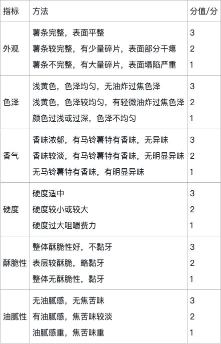 真空油炸马铃薯薯条因其风味独特、食用便利在全球休闲食品市场占据重要地位。其外观、营养和质构等品质特性,受原料品种、加工工艺及包装储存条件等多因素影响。营养品质是油炸薯条品质综合评价的核心属性之一,已有较多研究针对不同马铃薯原料品种,通过测定其加工薯条水分质量分数、油脂质量分数、蛋白质含量、维生素含量及潜在危害物丙烯酰胺含量等指标,结合统计学方法比较分析,筛选加工适应性更优的马铃薯品种。薯条色泽和质构特性是影响消费者接受度的关键指标,传统上主要依赖感官评价评定。而感官评价易受评价者个体偏好影响,难以建立普适性客观标准。因此,基于仪器分析的多指标客观评价方法在食品品质领域得到广泛应用。色差仪可量化薯条色泽为L*、a*、b*值,质构仪及质地剖面分析(texture profle analysis,TPA),可精确量化硬度、破裂力、内聚性、弹性、胶黏性和咀嚼性等关键质构参数。TPA模式对人类口腔咀嚼过程的模拟性良好,其测定的质构参数能有效反映薯条在口腔中的力学行为与感官体验。