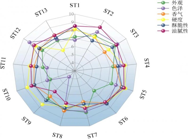 对13个样品进行感官评价,不同品牌薯条的外观、色泽、香气、硬度、酥脆性和油腻性6项指标存在显著差异(P<0.05)。ST10外观得分最低,ST9色泽和油腻性得分最低,ST3香气得分最低,ST2酥脆性得分最低,ST13硬度得分最低(图3)。13种薯条感官得分均低于85分未达到优质,10种薯条得分在75~85分表现为良好,3种薯条得分在65~74分表现为一般。ST5综合得分最高为84.28分,ST9得分最低为69.28分,感官品质较差(表5)。