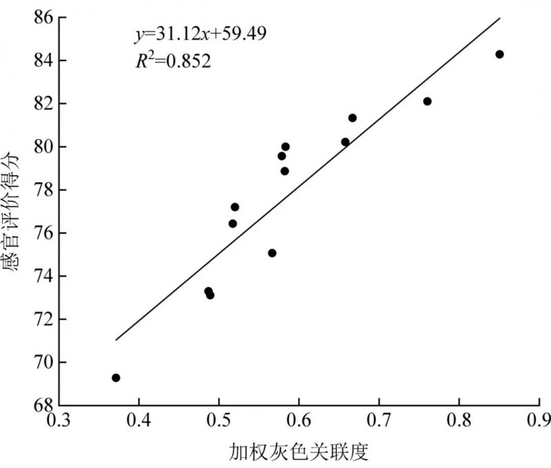 结果验证利用回归分析对感官得分和评价模型综合得分进行拟合,得到线性方程y=31.12x+59.49(R2-0.852)(图6)。表明以油脂质量分数、a*值、咀嚼性、维生素C含量和内聚性建立的品质综合评价模型能够准确评价真空油炸薯条品质优劣。