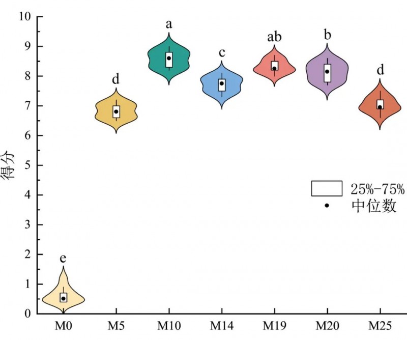 感官评价结果显示(图8),各样本得分由高到低分别为M10、M19、M20、M14、M25、M5,不同样本得分差异显著(箱线图中位值、25%-75%区间分布不同)。M10得分最高,推测对应香气活性物质与受体作用强,分子动力学模拟后构象稳定,能高效触发愉悦感,其OAV值为19973,该化合物嗅觉愉悦度较高,但其OAV值远超其余化合物,过高的浓度可能使得M10溶液易造成嗅觉疲劳、采用 IBM SPSS Statistics 26 进行单因素方差分析,显著性水平设为a=0.05,结果显示,M10(8.2±0.5分)与M19 (7.9±0.6分)的愉悦度无显著差异(P-0.32)。M19得分次之,其香气活性物质可能通过疏水、氢键等协同作用,在感官层面呈现较好适配性与Liu Mingxiu等人的研究结果类似。M20、M14得分中等,或因气味层次单一、OAV值低,虽结合靶点较好,但感官愉悦度受香气复杂度限制。这两种化合物中M20的OAV值为47.13,低于M14的65.4,但总体看来,M20的愉悦度更高,这可能是由于M20与靶点蛋白的结合性能更好,在低OAV的情况下依然能带来高愉悦度;M25、M5得分低,可能与成分在感官层面的协同效应弱、香气层次不足有关;MO为4.15%的乙酸溶液的对照组,仅有一定的刺激性气味,故得分最低。