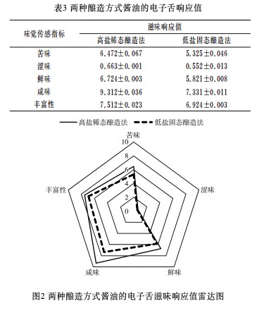 两种酿造方式酱油的电子舌滋味响应值及其雷达图见表3和图2。由表3和图2可知,两种酿造方式酱油的滋味成分中咸味的占比都最高,其次是滋味的丰富性、鲜味和苦味,而涩味的占比最低。然而,对比高盐稀态酿造和低盐固态酿造这两种方式,发现高盐稀态酿造酱油在各种滋味成分上均表现出更高的数值。
