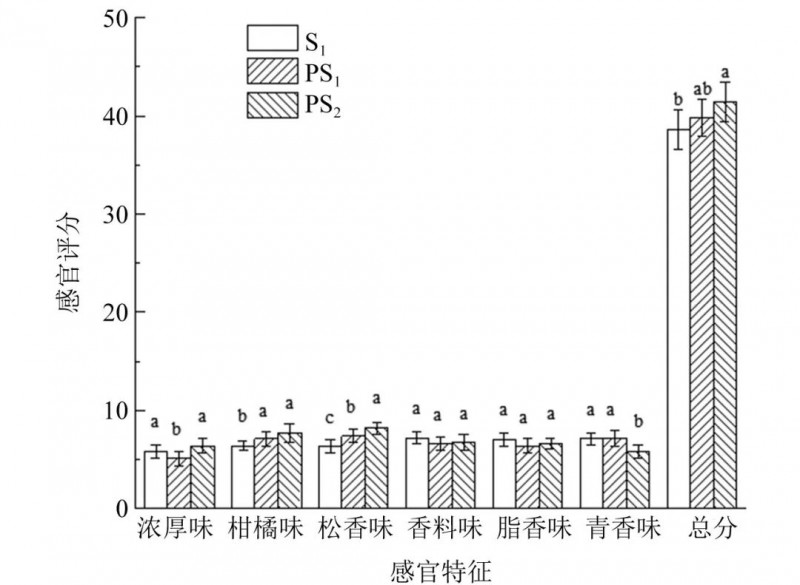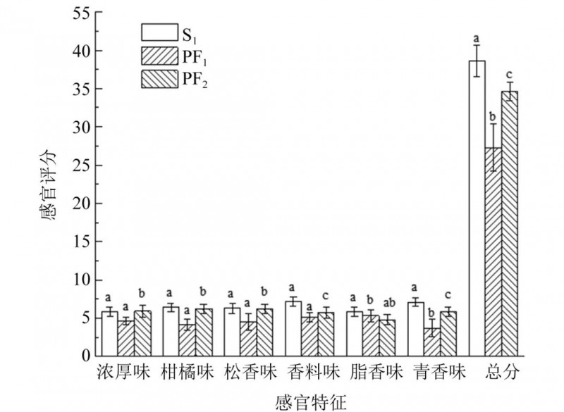 牛油,广汉市迈德乐食品有限公司;甘肃陇南武都花椒(水分<11 %)、白酒(乙醇体积分数53 %),市售;甲醇,色谱纯;邻二氯苯、正构烷烃标准品,上海阿拉丁生化科技股份有限公司;羟基-a-山椒素、羟基-β-山椒素、羟基-γ-山椒素标准品(纯度>98 %),中国成都麦森科技股份有限公司。02感官评价方法感官评价方法参考文献的方法稍作修改。将50 mL炸制花椒后的牛油倒入洗净的烧杯中,由10名专业人员进行感官评价。根据风味剖面法对样品进行分析描述,确定样品的6个呈香属性分别为浓厚味、柑橘味、松香味、香料味、脂香味及青香味。对不同的气味强度由弱到强从0~9进行赋分(浓郁7~9、适中4~6、较弱0~3)。对所有样品进行3次感官评价,结果取平均值,比较不同样品之间的香气特征。