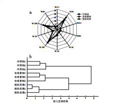 图3-a显示了不同窨制工艺咖啡样品对电子鼻传感器响应的雷达图,3组咖啡样品对W5S、W1W和W2W传感器的响应值较大,这3种传感器分别对氮氧化合物、有机硫化物和无机硫化物反应灵敏,其中2种窨制方式茉莉咖啡与对照组在W5S、W1W和W2W,传感器响应值差异明显,表明这3个传感器对咖啡挥发性气味区分效果较好。如图3-b所示,聚类分析将处理组、窨制组有效分为两大类,表明咖啡豆经茉莉花窨制后香气与对照组明显不同。此外,聚类分析又将传统窨制与湿坯连窨更详细地分为两小类,表明窨制工艺不同也会造成风味上的差异,这一结果与茉莉咖啡的感官评价呼应。