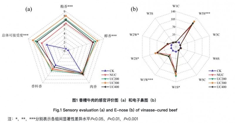 香糟牛肉的感官评价结果如图1a所示,UC200、UC300和UC400组总体可接受度、酯香和醇香评分值高于CK和NUC组,UC200、UC300和UC400组的酯香评分值分别由CK组的0.5和NUC组的6.25增加至7.23、8.00和7.02(P<0.05),且UC300组高于UC200和UC400组。香糟牛肉的肉香和香料味在各组间无统计学差异。这些结果表明,300 W超声辅助糟制处理显著提高了香糟牛肉的酯香味。电子鼻是识别风味类型的重要工具。本研究中,W5S的特征香气为氮氧化合物,W2S的特征香气为醇、醚、醛、酮类物质。图1显示,UC300组W5S和W2S传感器响应值高于其他处理组(P<0.05),表明UC300组香糟牛肉的醇类、醚类和醛类化合物的浓度高于其他组别。这些化合物具有果香、花香和酒香味,进一步验证了超声处理组中酯香和醇香的变化。