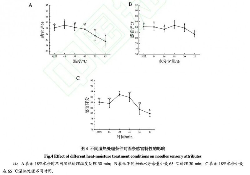 由图 4A 可知,小麦在 18%水分含量下经过不同温度处理 30 min 后,面条感官评分范围在 79.8~85.9 之间,随着湿热处理温度的升高,面条感官评分逐渐下降,45~65 ℃处理之间感官评分无显著变化(P>0.05),75、85 ℃处理后,面条适口性与韧性变差,感官评分显著下降(P<0.05)。由图4B 可知,在 65 ℃处理 30min 条件下,小麦初始水分含量为18%时,感官评分最高,面条色泽鲜亮,口感爽滑,各水分含量处理之后感官评分之间无显著差异。由图 4C 可知,18%水分含量小麦在 65 ℃加热,随着处理时间的延长,面条感官评分呈先升高后下降趋势30min时感官评分最高,时间长于60 min后感官评分显著下降。较高强度的湿热处理会降低小麦粉糊化峰值粘度,影响面条感官评分。有研究表明,小麦粉糊化峰值粘度越大,面条感官总分越高。