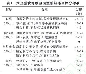 根据柴振宇等制作的发酵乳感官评分表,邀请10位评价人员从口感、滋气味、组织状态、颜色等方面进行感官评价,感官评分标准见表1。