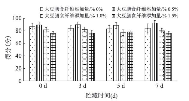 添加不同比例的大豆膳食纤维制备凝固型酸奶,在贮藏7d内,经10位评价人员的评分,得到酸奶的感官评价结果如图4所示。添加大豆膳食纤维的酸奶底部出现轻微沉淀,四组酸奶的颜色相差不大,均为乳白色,因大豆膳食纤维本身纤维特性,入口后易出现不适的颗粒感,口感较为粗糙,使酸奶整体感官品质下降,从而降低评分。贮藏7d内各组发酵乳的感官并没有显著变化(P>0.05),添加0.5%大豆膳食纤维的酸奶在口感、滋气味、组织状态方面更令人满意。