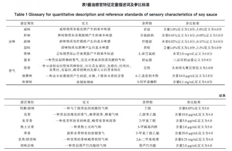 选择7名(男4名,女3名)经过感官培训的专业人员组成评价小组,确定酱油的12种香气特征描述词和5种滋味特征描述词,并对所有的描述词进行定义,确定其参照物和建立强度标度(见表1)。样品制备参照项目组前期报道方法进行感官评价训练及测定过程采用定量描述分析(quantitative distriminant analvsis,QDA)方法,要求评价小组成员采用5分制对酱油样品的风味轮廓进行打分,其中强度描述为没有感觉(0)、弱(1)、稍弱(2)、平均(3)、稍强(4)和强(5)。