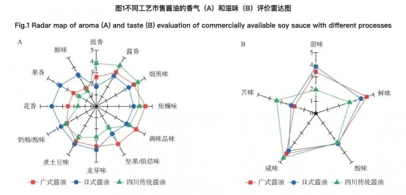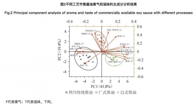 采用QDA法对三种工艺市售酱油进行感官评定,结果见图1。由图1A可知,四川传统酱油的酱香、豉香和烟熏味突出,其平均强度分别达到4.22、3.83、4.29;而广式酱油的调味品味、焦糖味和坚果/烘焙味平均强度最高,分别为4.11、4.40、3.88;日式酱油则花香、果香和醇味突出,其平均强度分别达到3.97、3.73、3.24。广式酱油与日式酱油的香气特征与前人研究结果一致。由图1B可知,广式酱油和日式酱油中咸味和鲜味是最强烈的滋味特征,其平均强度分别为4.13、3.81和4.39、3.91;其次是甜味和酸味,而苦味强度较弱。相比之下,四川传统酱油的滋味特征以咸味为主,平均强度达4.54;而鲜味和甜味相对较弱,平均强度分别为2.91、1.95;且苦味强度较高。不同工艺酱油由于其原料配比、发酵条件、发酵菌种及产地等不同导致产品风味成分差异,进而影响酱油的感官品质。