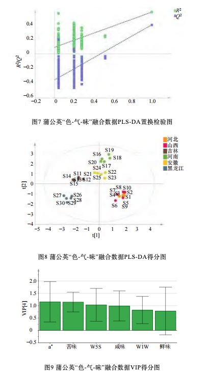 PLS-DA为了进一步寻找蒲公英产地差异区分的关键特征指标,对融合数据进行PLS-DA。该模型累计解释能力参数R2X和R2Y分别为0.930和0.714,预测能力参数Q2为0.592,均>0.5,对PLS-DA进行200次交叉验证(图7),左侧所有绿色R2值和蓝色Q2值均低于右侧样品点,R2及Q2与Y轴的交点分别为0.177和−0.524,表明所建立的模型稳定可靠且具有良好的预测性且未过拟合。由PLS-DA得分图(图8)可知,产地归属与PCA及聚类结果大致相同,以VIP≥1为标准,得到3个质量差异特征指标(图9),依次为W5S、a*和苦味,分别为代表了气味的氮氧化合物、颜色的红绿色度以及味道中的苦味,说明色、气和味的数字化特征指标均对蒲公英的产地区分有着重要的意义。