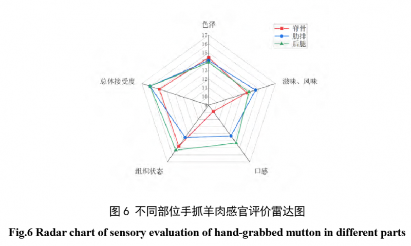 分析羊肉感官品质与许多因素有关。由图6不同部位手抓羊肉的感官评价可以看出,肋排在滋味、风味感官评价得分高于其他两个部位,这可能跟肋排脂肪含量有关,肋排中有壬醛、正辛醛等肉香味物质含量高。Wu 等研究表明,羊肉热加工引起的脂质氧化是肉味的关键原因,说明羊肉不同部位制成的手抓羊肉风味不同是由于脂肪氧化所产生的脂肪酸组成不同。色泽上三个部位手抓羊肉没有太大差异,肋排煮制成的手抓肉的感官评价的风味得分最高,在总体接受度上后腿的感官评价总分得分最高。