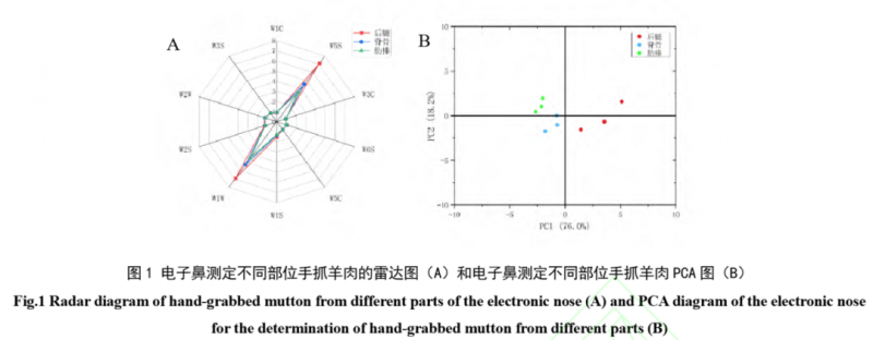 分析电子鼻是模拟人类嗅觉系统,通过传感器阵列对挥发性化合物进行快速检测,实现对样品整体气味轮廓表征。目前,电子鼻广泛应用于不同加工方式、品种、部位等肉制品的风味差异分析。如图1所示,三个部位手抓羊肉均在 W1W、W5S 的传感器上响应值较高,且存在较大差异,其中后腿在这两个传感器上响应值最大,其他传感器基本重合。而对传感器 W3S、W1C、W3C、W6S、W5S 信号强度较弱,说明三个部位手抓羊肉中中氨类、烯烃类、烷烃类物质含量相对较低。进一步对不同部位手抓羊肉的香气进行主成分分析(Principal ComponentAnalysis,PCA),第一成分贡献率 76.0%。第二成分贡献率 18.2%,累计贡献率 94.2(大于 90.0%),能较好的反应手抓羊肉的整体信息。三个部位手抓羊肉在 PCA 图中区域分散,说明电子鼻能较好区分三个部位的香气。