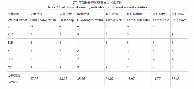 依据核桃坚果描述型性状及赋值标准,对5个供试核桃品种坚果的主要感官指标进行综合评测,其果实形状、果面特点、隔膜质地、取仁难易、核仁饱满度、核仁颜色和果实风味等感官指标的数量化评价结果见表2。由表2可知,XL和LH1坚果为椭圆形,大小均匀,形状一致,XL3和QK坚果卵圆形,形状基本一致,TLE为尖圆形;XL3、TLE和XL果面光滑,LH1较光滑,QK较麻;XL3隔膜质地为膜质,TLE为革质,其余品种均为纸质;X和QK取仁难易程度为中等,易取半仁,XL3、TLE和LH1则易取整仁;除QK外,剩余4个品种核仁饱满,果仁颜色方面仅TLE为浅黄色,其他品种均为黄白色,颜色较浅;核仁风味中,XL3和QK口感清香爽脆,TLE口感甜香可口,Ⅺ和LH1则口感油香丝滑。供试5个核桃品种感官指标间存在着丰富的变异,其中果仁颜色变异最小,果实形状变异系数最大。
