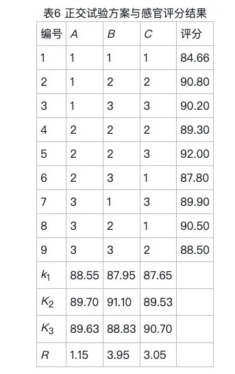 根据单因素试验结果,采用3因素3水平进行正交试验。正交试验因素与水平见表5。试验方案与结果见表6。