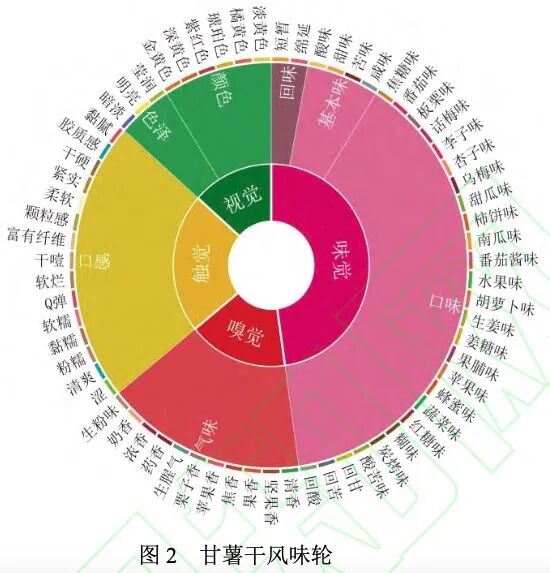 本研究通过系统分析甘薯干的感官特征,构建了甘薯干风味轮,并为其感官评价体系的建立提供了科学依据。采用层次分析法,确定了甘薯干感官评价指标的权重:味道(40%)、口感(35%)、气味(10%)和外观(15%)。通过聚类分词及主成分分析等方法进行筛选确定了 9 个味道描述词、6 个气味描述词、5 个外观描述词和 9 个口感描述词作为甘薯干风味轮的核心描述语,并基于 CATA 和 QDA 方法制定了甘薯干的感官评价标准。研究结果可将甘薯干感官描述性指标转变为数量值,将抽象的“好吃”转化为可被理解和感知的具体风味语言,为甘薯干生产者和消费者之间的感官沟通提供基础,对甘薯干品质评价和工艺改良提供一定的指导意义。由于商业信息的限制,本文未对甘薯干感官差异进行鲜薯品种、甘薯干加工工艺进行归因,未来研究可将感官评价、仪器分析与消费者偏好深度融合,以本研究确立的核心描述词(如“甜味”、“胶质感”、“软糯”、“清香”、“Q 弹”、“焦香”、“黏糯”等)等作为考核指标,解析甘薯原料品种、核心加工工艺(蒸制/烤制温度、时间等)与甘薯干食用品质的关联及其可能机制,为高品质甘薯干的甘薯品种筛选和工艺改良提供依据。