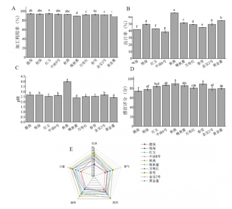 为此,研究选取燕山地区10个典型桃品种,围绕桃汁加工需求,系统测定其质构特性、感官品质、营养指标,包括可溶性固形物、可溶性糖与可滴定酸、糖酸比与固酸比,以及果实加工利用率、出汁率与果汁pH值等加工性能。旨在明确不同品种在果汁加工中的适用性差异,建立面向桃汁加工的多维品质评价体系,为优选高适配品种、优化加工工艺提供理论依据与数据支持、从而推动桃产业实现提质增效与可持续发展。