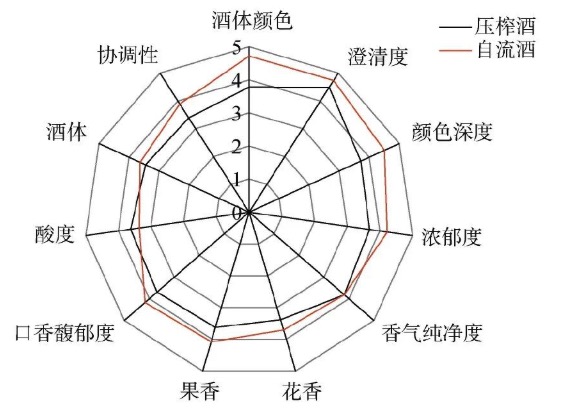 由图1可知,'赤霞珠’压榨汁桃红酒和自流汁桃红酒清亮透明,有光泽,颜色为黄玫瑰红,略带石榴色,自流汁桃红酒的酒体颜色相对压榨汁桃红酒而言更加鲜艳,颜色更深;在香气的感官评价中虽然游离态香气中压榨汁桃红酒的酯类物质含量显著高于自流汁桃红酒,但是花香、果香表评价不如自流汁桃红酒、这可能是因为压榨汁桃红酒中含量显著高于自流汁桃红酒的异戊酸乙酯和已酸-2-苯乙基酯含量过高,为酒体的香气呈现带来负面影响。自流汁桃红酒入口柔和,糖酸协调,结构感强,整体来说协调性好,宜饮;压榨汁桃红酒入口也较为柔和,但酸度较高,尾味略有不足,因此表现略差。这是因为在压榨制汁中,果皮中的单宁、色素以及其他物质得到释放,其中会包含一些劣质单宁以及呈味物质,尤其是酸味物质,因此压榨汁桃红酒的感官评价酸度更强。