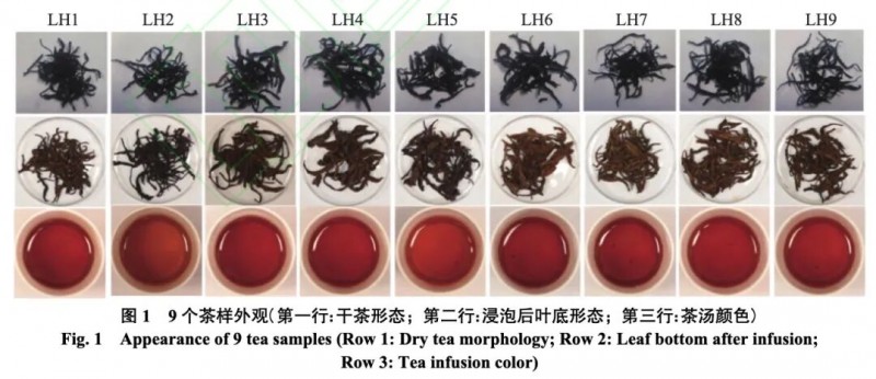 茶的外观是判断茶品质的重要因素,将 9 个样品进行冲泡之后,茶的外观如图 1 所示,其他感官指标如表 2 所示。不同的茶样茶叶形状、颜色和所泡茶汤有所差异。LH1 和 LH2的茶底均较紧实,其他茶样茶底则是呈紧实和舒展混合状态。9 个样品的茶汤颜色有所差异,LH1和 LH6 呈靛红色,LH2 和 LH5 茶汤颜色偏橘红色,而 LH3、LH4、LH7、LH8 和 LH9 呈棕红色,所有茶汤均明亮带金圈。并且与之前的研究结果类似,大叶种红茶的香气均浓郁带蜜糖香和花果香。