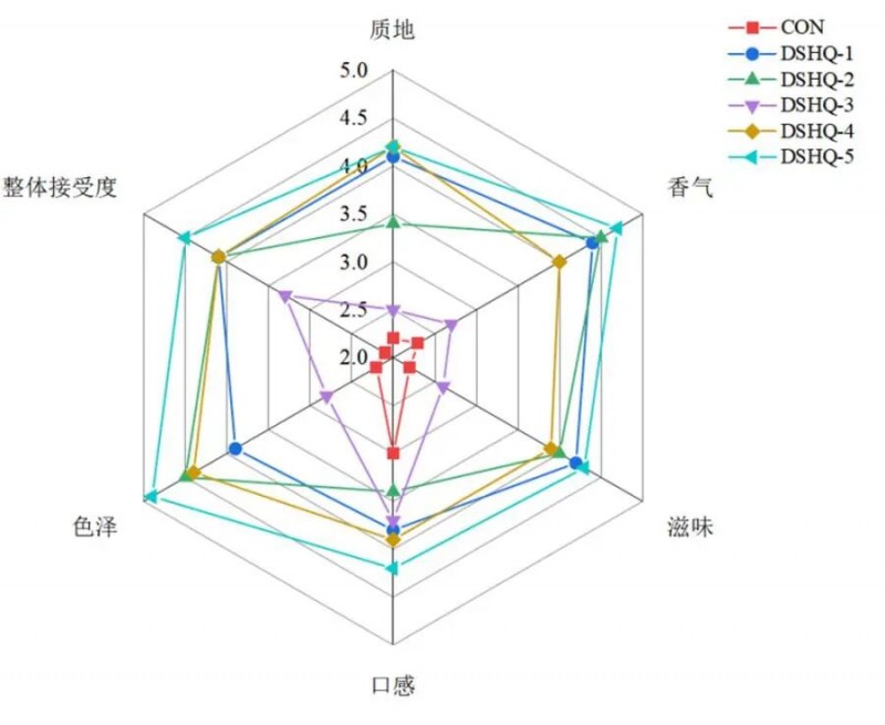 感官属性(包括滋味、质地、香气和色泽等)的客观评价能反映消费者的接受度和偏好度。如图3所示,各添加组炖鸡肉的感官评分在所有评价维度均显著高于对照组(P<0.05),其中DSHQ-5组评分最高,感官品质最优,表现为色泽鲜亮、肉质鲜嫩多汁、口感醇厚,且整体接受度高,可能是党参和黄芪的微甜味能够掩盖鸡肉中的不良腥味。此外,党参中含有60-100种挥发性香气成分,黄芪中含有80-100种挥发性香气成分,这些挥发性香气成分能丰富炖鸡肉的风味层次,对整体感官评分带来积极影响。CON组鸡肉则颜色偏浅,香气的协调性和融合性不佳,滋味丰富度和浓郁度低,总体感官接受度低。