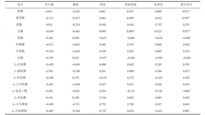 如表9所示,各类氨基酸含量与感官评价得分相关性不显著。果糖、总糖含量与甜味、果肉质地和化渣度评分呈显著正相关,与感官评价总分呈极显著正相关;葡萄糖含量与果肉质地呈显著正相关,与感官评价总分呈极显著正相关关系;乳酸含量与感官评价总分呈显著负相关。