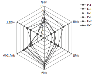 典型的黑巧克力除了主要的可可香气,还存在一些其他香气,有多元化的香气特征。从可可香、坚果香、烘烤香、果香、发酵酸、草本香、奶香7个方面对6组100%黑巧克力样品香气进行评价,结果见图10。由图10可知,P⁃1可可香、烘烤香、果香、发酵酸感官评分高,气味趋势与挥发性风味化合物定性结果相一致。P⁃1、E⁃1、G⁃1的果香感官评分高于P⁃2、E⁃2、G⁃2,表明由可可豆制备的100%BTB黑巧克力样品果香更明显。可可液块制备的100%黑巧克力的发酵酸气味感官评分整体低于可可豆制备的100%BTB黑巧克力。E⁃1中坚果香、奶香感官评分高于其他样品。图10 6组100%黑巧克力香气评价结果从果味、酸味、涩味、苦味、巧克力味、土腥味6个方面对6组黑巧克力样品的滋味进行评价,结果如图11所示。由图11可知,在苦味方面,6组100%黑巧克力样品感官评分分布均匀,苦味均明显。P⁃1酸味、果味感官评分较高,属于愉悦的莓果风味。可可豆制备的100%BTB黑巧克力的果味、酸味感官评分整体高于可可液块制备的100%黑巧克力。可可液块制备的100%黑巧克力土腥味感官评分整体高于可可豆制备的100%黑巧克力。感官评价结果表明,可可豆制备的100%BTB黑巧克力在可可香、坚果香、烘烤香、果香、奶香方面会更浓郁,在果味、巧克力味、酸味会更突显。