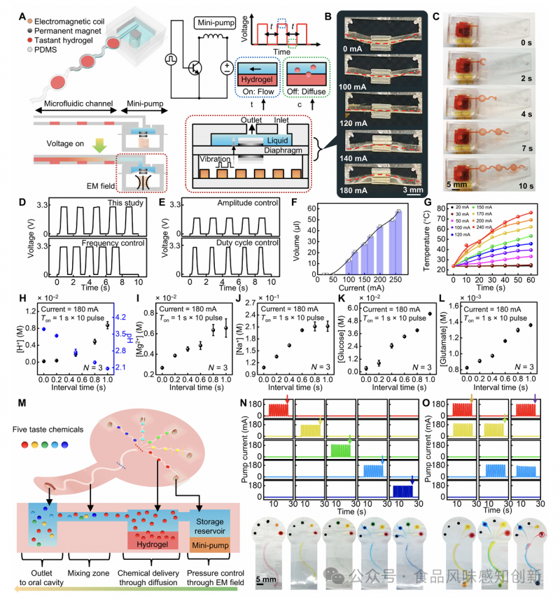 (图2)包括电磁致动器和微流体在内的味觉接口的特性描述。 注解:(2A) 展示了执行器的核心组成:PDMS液腔、钕铁硼永磁体、线圈和微流控通道。工作原理很简单,线圈通电产生交变磁场,带动磁铁振动,进而挤压液腔隔膜,把含味觉物质的液体泵入通道。(2B) 电流从0升到180mA时,隔膜最大能变形2mm,变形量直接影响液体输出量。(2C) 连续照片记录了10秒内液体被泵送的过程,能清晰看到液体在通道中流动。(2D-E) 通过调节电压幅度、频率、占空比,能精准控制泵液的节奏。(2F) 电流越大,10秒内泵出的液体越多(0-58μl),这个量刚好能被舌头感知到。(2G) 线圈工作时会升温,但实验显示合理控制电流(如180mA),20秒后温度约42℃,实际使用中用脉冲电流冷却,安全性有保障。(2H-L) 通过改变脉冲间隔时间,能精准调节五种味觉物质的浓度,比如葡萄糖(甜味)浓度可从3.27mM调到54.81mM,覆盖了日常食物的味道范围。(2M) 设计了五通道系统,每个通道对应一种味觉,可单独或同时工作。(2N-O) 用有色染料演示混合效果,比如红色+黄色变成橙色,证明能精准调配复杂风味。
