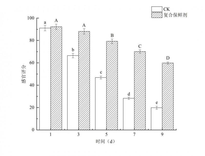 由图9可知,随着富硒酱板鸭贮藏天数的增加,感官评分均呈不同程度的下降,与对照相比,经复合保鲜剂处理后可有效维持感官品质。未经处理的富硒酱板鸭在4°C条件下存放3d后,感官评分显著下降,在5d时感官评分低于60,此时不被大众接受,食品不可食用。经复合保鲜剂处理后,4°C条件下可延长至9d左右,感官评分低于60。低温贮藏的过程中,食品仍在进行缓慢的氧化,而复合保鲜剂具有多种生物活性,如抗氧化性、抑菌性等,同时,茶多酚等天然保鲜剂本身具有独特的茶香,可对鸭肉散发的不良风味起到遮蔽效果,使不愉快的气味减少,从而使富硒酱板鸭整体的品质提升。