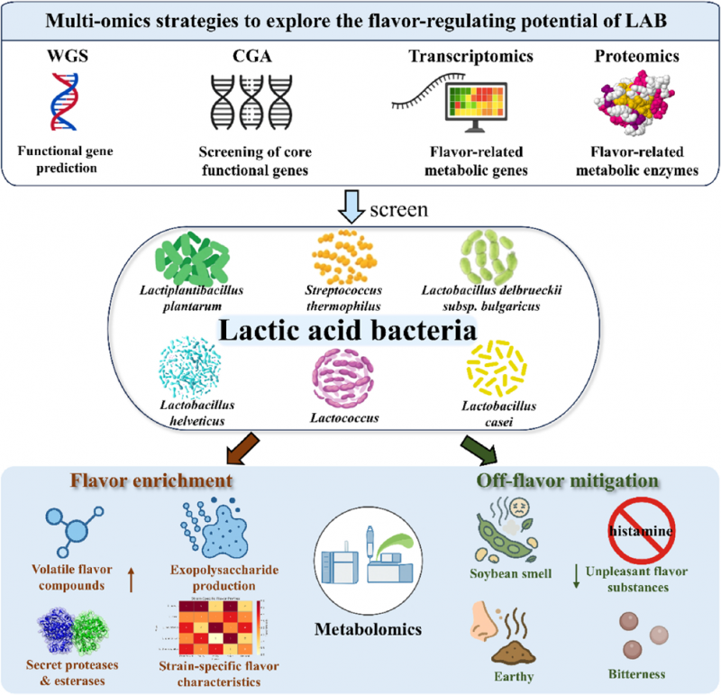 图1. 用于研究乳酸菌(LAB)在发酵饮品中风味调控潜力的多组学框架概述。通过全基因组测序(WGS)和比较基因组分析(CGA)鉴定功能基因潜力,利用转录组学和蛋白质组学表征风味相关代谢通路及酶的调控机制。结合代谢组学,该框架将乳酸菌菌株特异性的分子特征与风味增强及异味缓解相联系,为基于组学指导的精准风味优化提供理论基础。