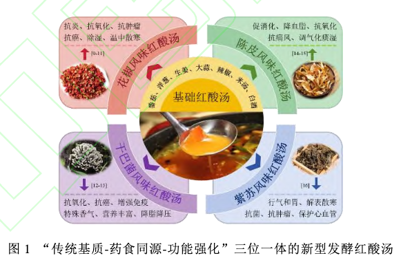 “药食同源”理念为地域特色资源的系统性创新提供科学依据。本研究首次将花椒 、干巴菌、陈皮、紫苏等地域特色药膳资源引入红酸汤发酵体系,构建传统基质、药食同源、功能强化三位一体的新型共发酵红酸汤(如图 1 所示)。通过协同发酵技术,系统解析药食同源原料对发酵红酸汤理化性质、风味物质和感官品质的影响,为突破传统发酵红酸汤调味品同质化困境提供新范式,对推动地域特色资源高价值利用、促进食品产业健康化转型具有重要的理论价值和实践意义。