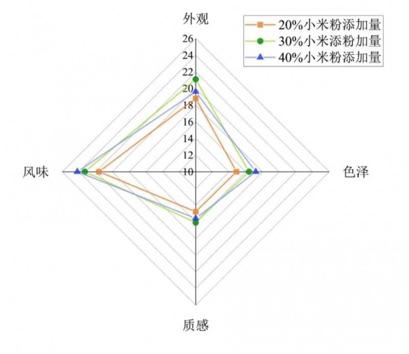 感官评价结果(图2)表明,小米粉添加量显著影响小圆子的感官品质。随着添加量的增加,小圆子的外观与质感评分呈先升后降趋势,风味与色泽评分则稳步提升。当添加量为30%时,各项评分及总分均达到相对最高值。具体而言,低添加量(20%)下,小圆子口感偏软、质感松散,结构支撑性不足,导致整体感官体验较差,这与该组质构特征中硬度低、黏弹性高的结果相一致。高添加量(40%)虽增强了风味表现(小米香气最为浓郁),但质地偏硬、口感粗糙,与质构分析中所示硬度最高、黏弹性和咀嚼性显著下降的情况高度吻合。因此,建议在小米小圆子产品开发中采用30%小米粉替代比例,以实现色泽、风味、口感与质构性能的最佳平衡。