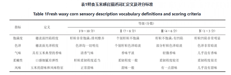 剥去鲜食玉米样品的包装,清洗干净,放入沸水中煮20 min,取出放于案板上,沥干水分,切成3~4 cm小段。由30人组成的感官评定小组对玉米样品进行评分,每次品尝前用清水漱口。评价标准见表1。