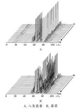 将各30批八角茴香与莽草样品的色谱图,建立以MXT-5色谱柱采集信号为主的八角茴香与莽草样品气味色谱瀑布图,结果筛选出26个分离效果较好且峰面积较大的气味色谱峰作为主要成分进行后续分析。详见图1和图2。