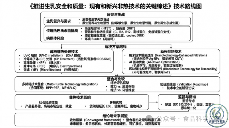 文章认为,非热技术为全球乳业在“生乳安全性”与“天然品质保持”之间提供了具有转型意义的解决方案。UV-C、CP、HPP、PEF、MF 及其多重障碍组合,能够在显著降低病原负荷的同时,更好地保留维生素、生物活性蛋白和感官特征;而 AI、区块链与纳米过滤等新兴工具,则进一步拓展了非热加工在实时优化、全链条透明化与高值化产品开发中的应用边界。未来,该领域仍需围绕工业放大、长期营养稳定性、生命周期评估及标准化监管验证开展系统研究,以推动安全、真实且高品质生乳加工体系的建立。