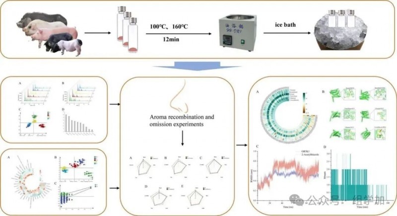 中国是世界上最大的猪肉生产和消费国,2024 年的产量和消费量分别达到 5706 万吨和 5810 万吨。风味是决定猪肉品质的关键因素,直接影响消费者的偏好和购买决策。中国拥有丰富的本土猪种,因其独特的风味而备受珍视。例如,BM,一种小型的中国本土猪种,以其加工产品而闻名,尤其是烤猪肉,这是其所在地区的一种传统美食,具有文化意义。ZX主要在海拔超过 3000 米的高山地区饲养,其特点是体型小、肉质鲜嫩、色泽鲜红、脂肪含量低。这些特点,加上其独特的高海拔栖息地,显著影响了其独特的香气化合物组成。相比之下,RC,中国最著名的本土猪种之一,体型较大,肌内脂肪含量较高,为风味的形成提供了丰富的脂质前体。同样,源自中国北方的SX具有较大的体型和明显的皮下脂肪沉积,共同造就了猪肉风味的多样性。高温烹饪方法,如烧烤、油炸、煎和炒,是猪肉加工的主要方式,在风味形成中起着关键作用。尽管现有研究已对烹饪过程中的风味特征进行了探索,但这些研究并未关注不同品种之间的差异,尤其是在高温加热条件下的差异,而这对于猪肉品质而言十分重要。