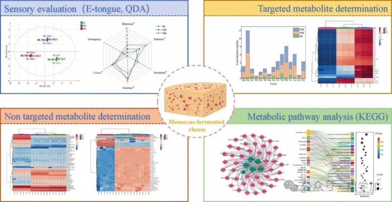 非靶向代谢组学的发展为全面解析食品发酵过程中的代谢重塑提供了强有力的工具。将这些代谢组学数据与感官评价相结合,有助于识别可能影响风味变化的关键化合物。例如,综合代谢组学和感官分析已被用于阐明格拉纳帕达诺奶酪、帕尔马干酪和切达干酪的成熟生物化学过程,为特定代谢物如何影响整体风味感知提供了深刻的见解。值得注意的是,红曲霉属物种具有与传统用于奶酪生产的青霉属或曲霉属物种截然不同的次级代谢网络,尤其擅长合成聚酮化合物。这种代谢特征的差异意味着红曲霉可能在呈味活性物质的组成和形成机制方面表现出独特的模式。因此,系统阐明其风味形成机制不仅对于理解该产品的质量至关重要,也为探索发酵乳制品中由真菌驱动的风味调节提供了新的研究视角。